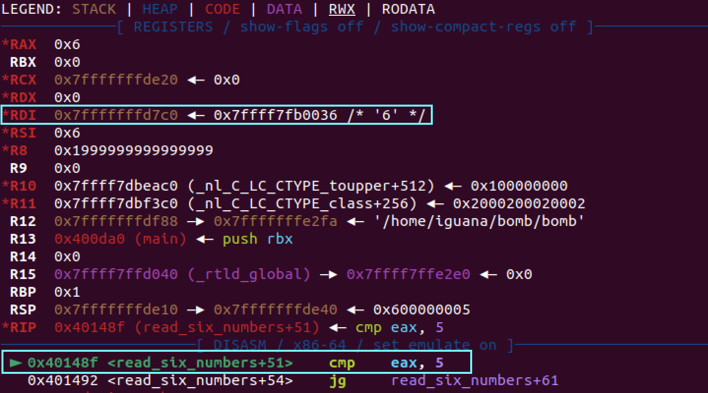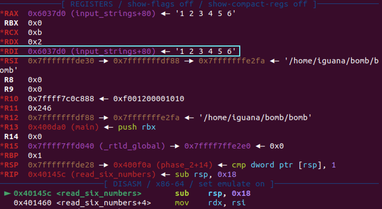 이번에는 read_six_numbers 이후에 rsp에 들어있는 입력값을 어떤 식으로 다루는지를 상세하게 분석할 것이다.
