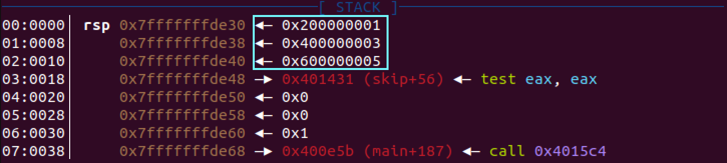 rbx에 두번째 숫자 주소를 입력하고 rbp에는 여섯번째 숫자 다음 주소 즉, 끝부분의 주소를 입력한다.
