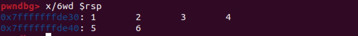 $rsp를 기준으로 word단위의 데이터 6개를 decimal(10진수)로 examine(출력해서 검토) 하겠다.