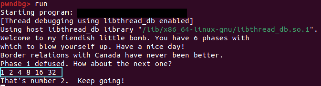 따라서 1 2 4 8 16 32를 입력하면 폭탄을 해체할 수 있다.