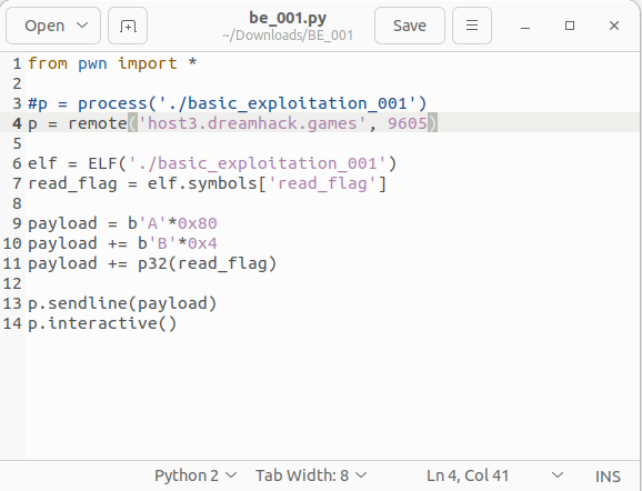 11행에서는 read_flag의 주소를 패킹해서 payload에 삽입했다.