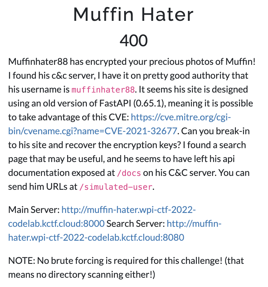 Muffinhater88의 사이트가 FastAPI 0.65.1 버전을 사용 중인데, 0.65.2보다 낮은 버전은 CSRF 공격에 취약하다는 설명이 있다. 따라서 CSRF 공격을 시도해볼 수 있을 것이다.