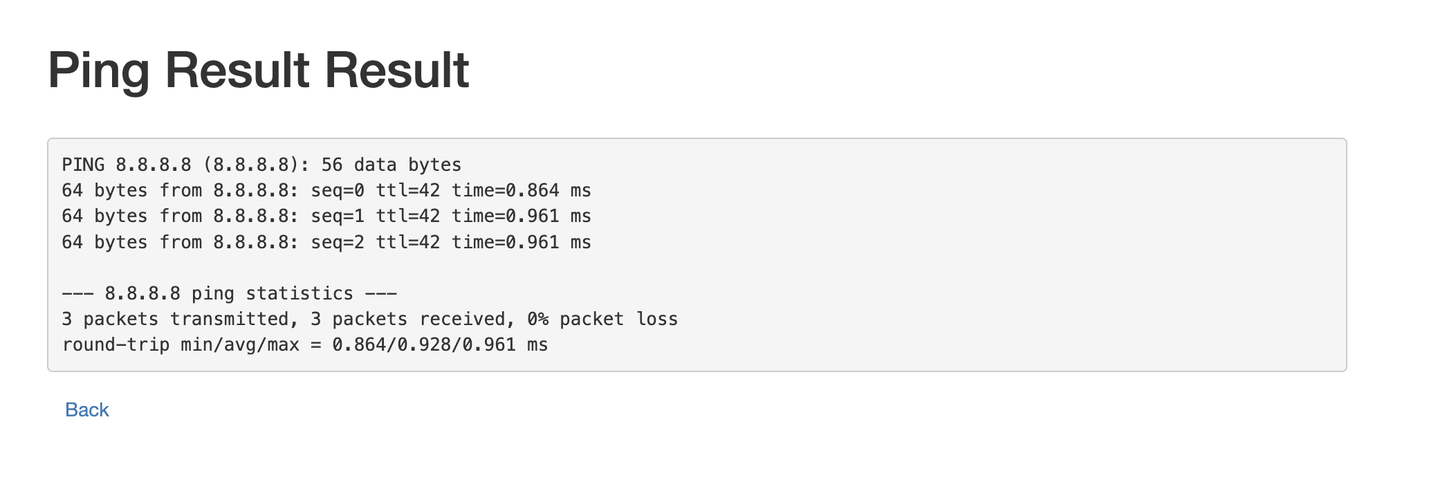 ping이 보내져 그 수신 결과를 볼 수 있다. 앞서 살펴본 코드에 따르면, 입력한 값 8.8.8.8이 ping -c 3 8.8.8.8이라는 명령어로 처리되어 셸에서 실행된 것이다.