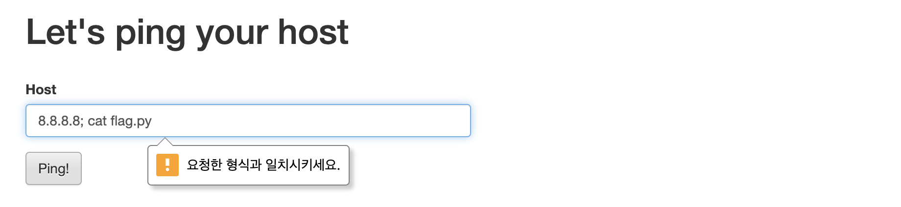 문제에서 플래그는 flag.py에 있다고 했으니 command injection 공격을 통해 flag.py 파일을 읽어내는 명령을 시도해봤다. 입력값 8.8.8.8 뒤에 명령어 한 줄을 마치는 기호 ;을 붙이고, 이어서 flag.py파일을 읽어내는 명령어 cat flag.py를 입력했다. 그런데 ping! 버튼을 클릭했더니 "요청한 형식과 일치시키세요."라는 경고문이 뜬다.
