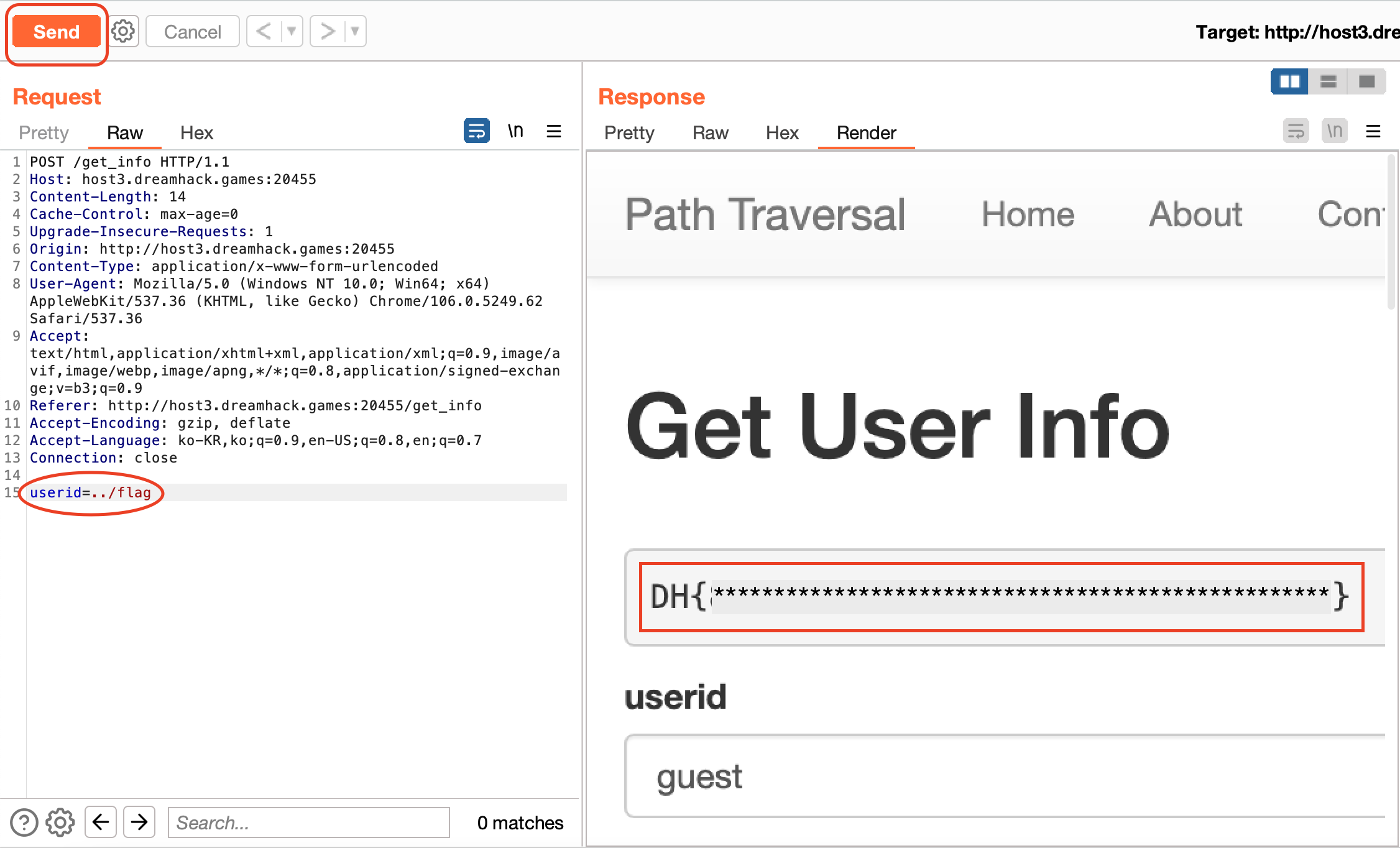 userid의 값을 ../flag로 하여 Send를 클릭해 요청을 보내면 Response의 Render페이지에서 플래그가 출력된 것을 확인할 수 있다.