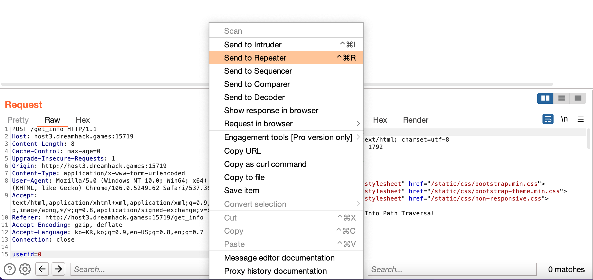 Request에서 우클릭하여 Send to Repeater를 클릭한다. 그리고 메뉴바의 Repeater로 들어가면 Request 값을 수정할 수 있다.