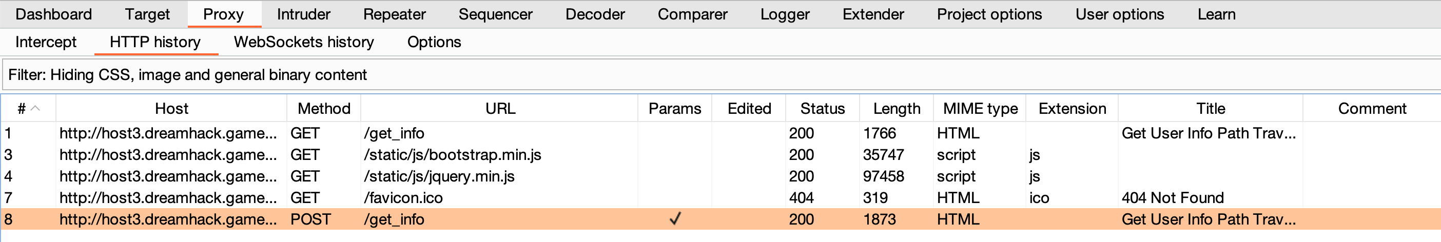 다시 proxy > intercept로 들어가서 open browser를 클릭해 브라우저 창을 연다. 주소창에 /get_info 엔드포인트로 접속한 주소를 복사해서 붙여넣는다.
