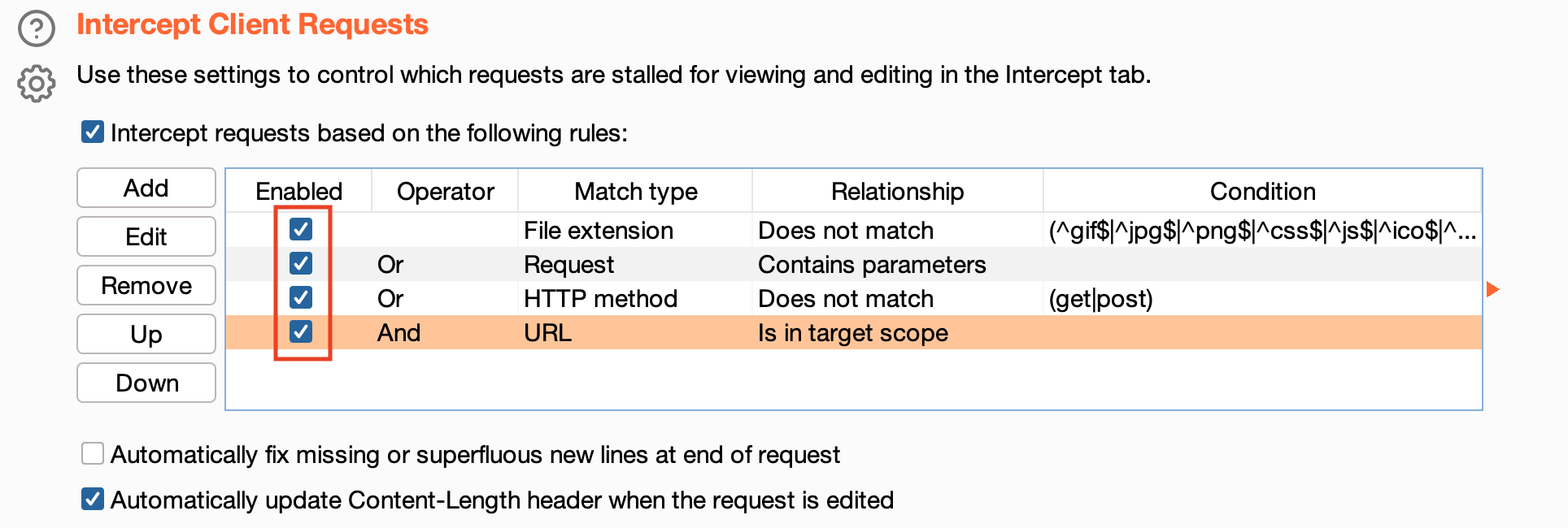 그리고 proxy > options 메뉴를 클릭해서 Intercept Client Requests 에서 요소들을 모두 체크한다.