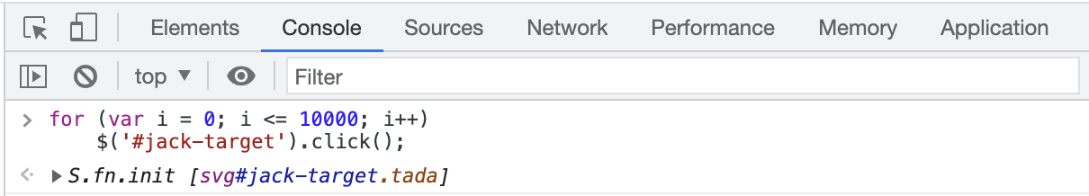 위와 같이 Console 창에서 jack-target 객체에 대해서 click() 함수를 10000번 반복하는 코드를 작성하여 실행하였다.