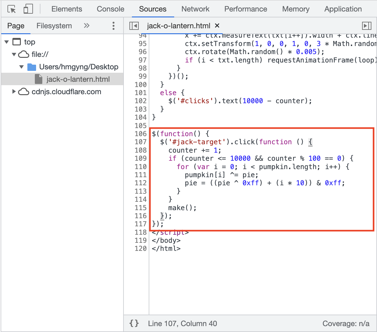Sources 탭에서 확인해보면 jact-target 객체를 클릭했을 때 클릭한 횟수를 세어 counter에 반영하는 함수가 코드의 107~116행에 있는 것을 확인할 수 있다. 이 함수를 콘솔에서 반복문으로 10000번 실행시켜 플래그를 얻어낼 것이다.