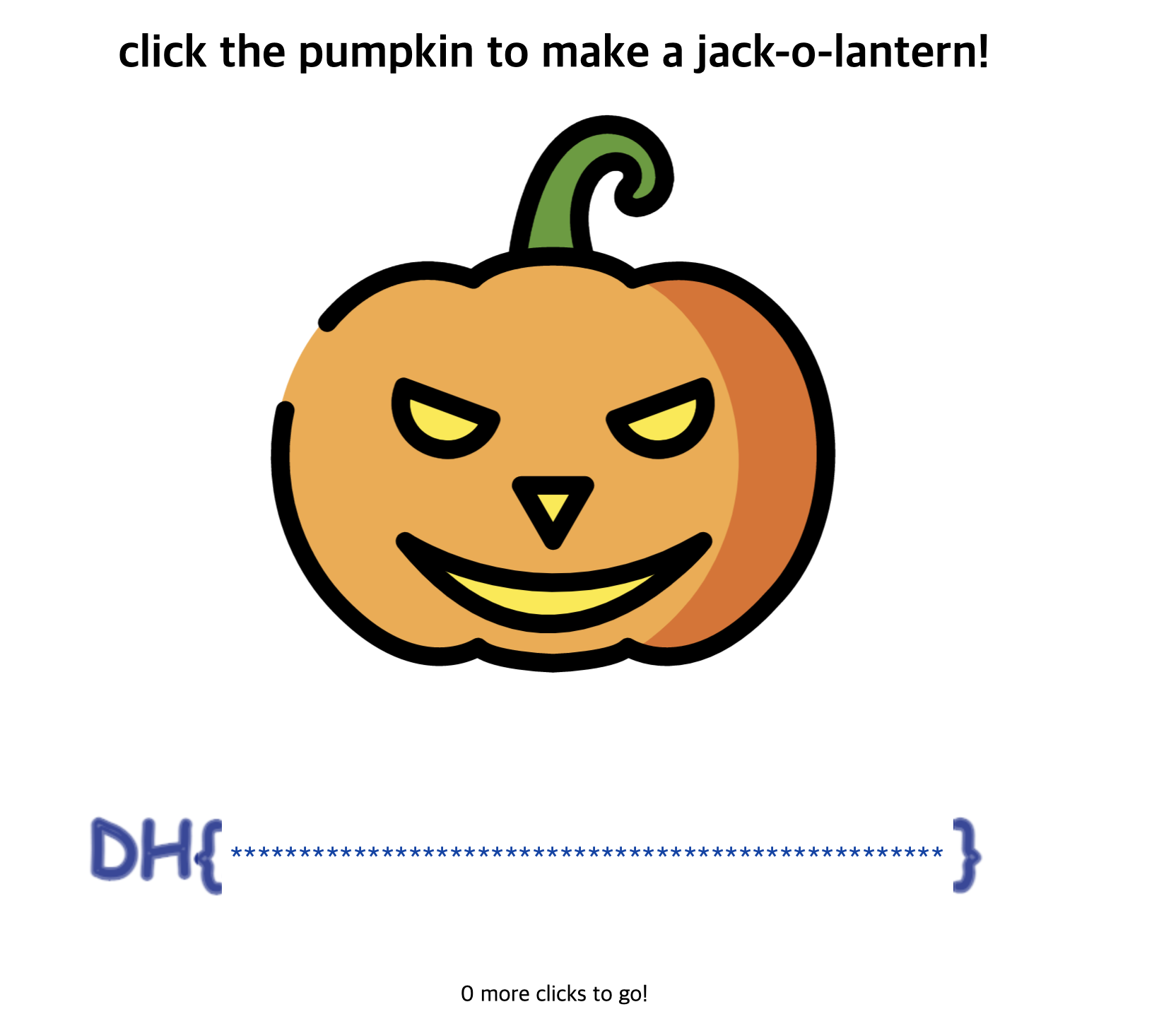 문제에서 다운로드한 파일을 열어보면 위와 같은 화면이 뜨는데, 호박을 한 번 클릭하면 아래의 문구가 10000 more clicks to go! 에서 9999 more clicks to go!로 바뀌는 것을 확인할 수 있다. 호박을 9999번 더 클릭하면 플래그를 얻을 수 있지만 코드상의 취약점을 찾아내어 더 빠르게 플래그를 얻을 수 있는 방법을 택하였다.