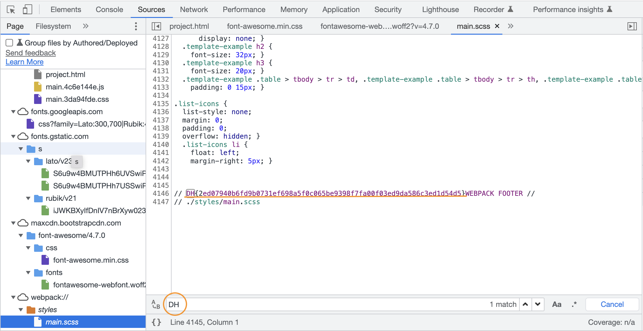 3. 소스탭으로 들어가 파일들을 하나씩 열어보며 DH{...} 형태로 된 플래그 찾기