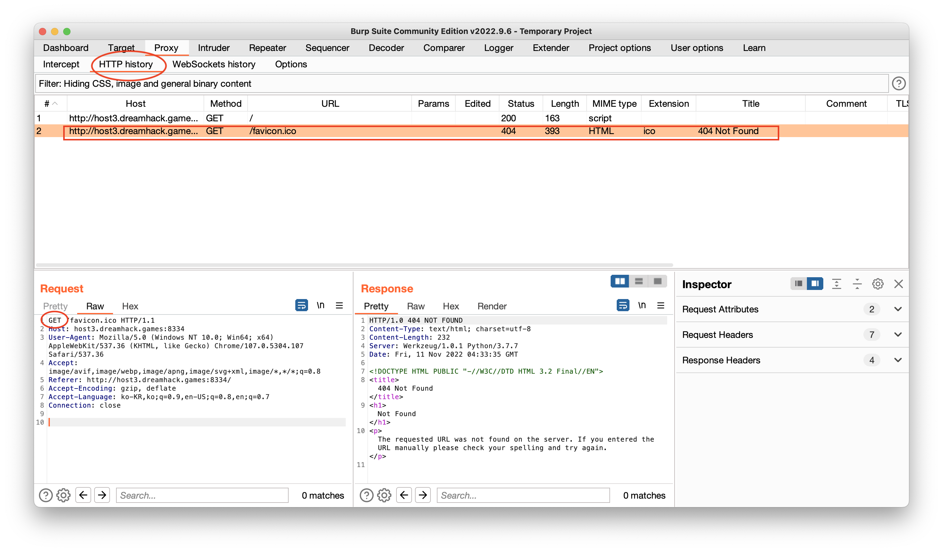 HTTP history 중에서 Method가 GET으로 요청된 것을 클릭하면 아래에 Request 정보와 Response 정보가 뜬다.