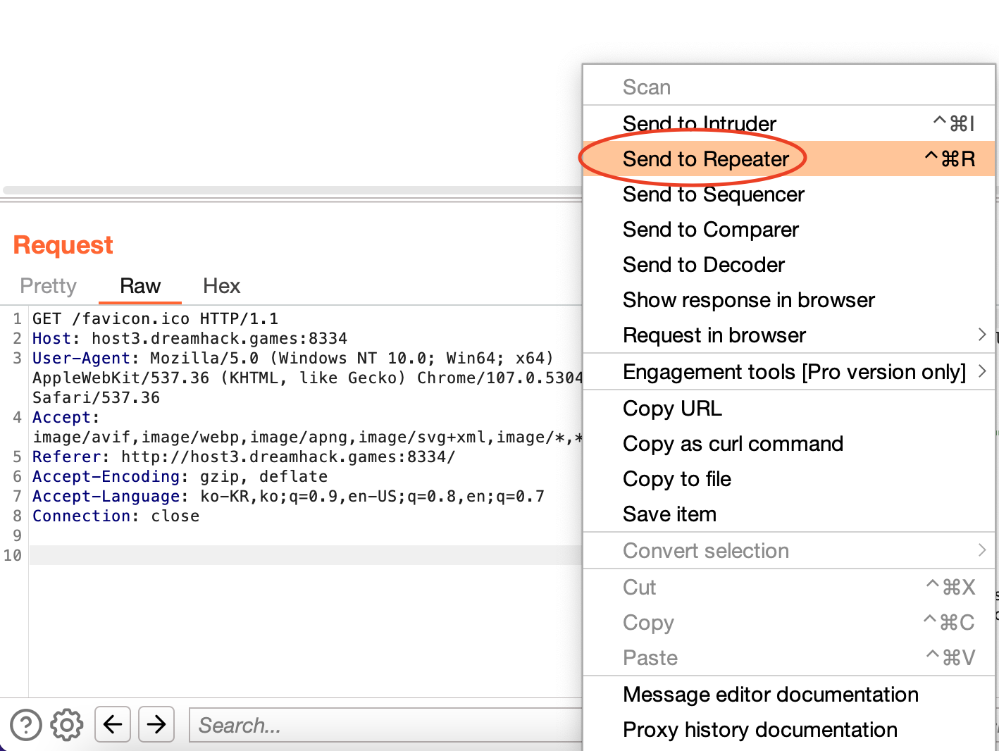 Request 창에서 우클릭하여 Send to Repeater를 클릭한다.