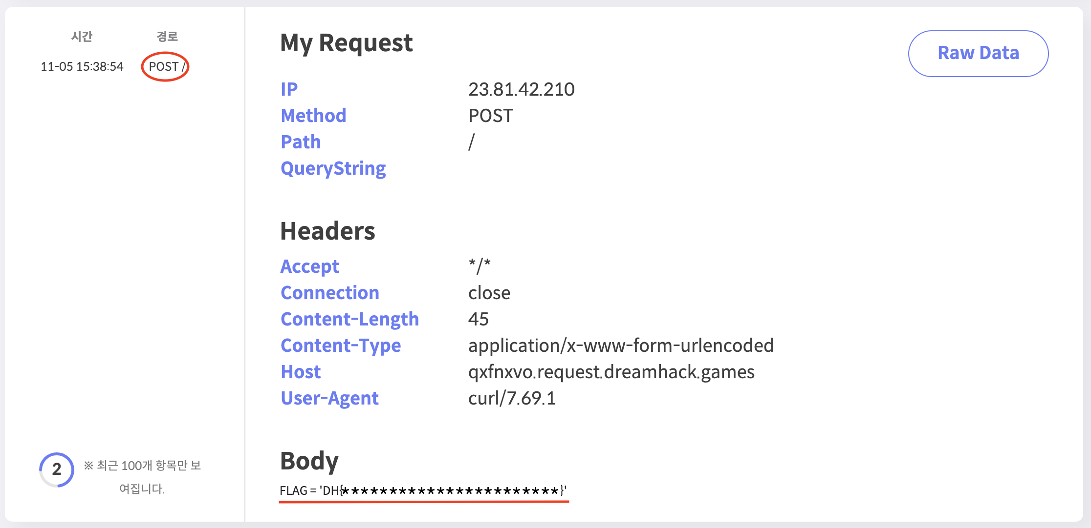 Dreamhack Tools로 돌아가면 POST로 요청된 기록이 뜬 것을 확인할 수 있다. 이것을 클릭하면 내부 데이터가 출력되는데, 여기에서 flag를 확인할 수 있다.