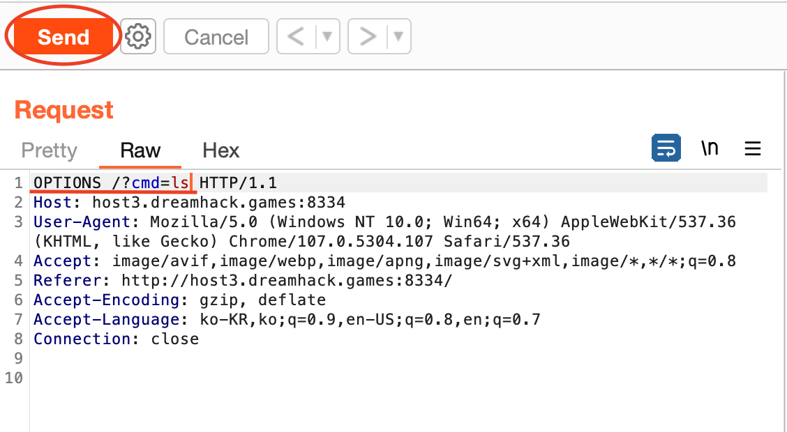 첫 줄에서 GET /favicon.ico 를 지우고 그 자리에 OPTIONS /?cmd=ls 를 입력한다.