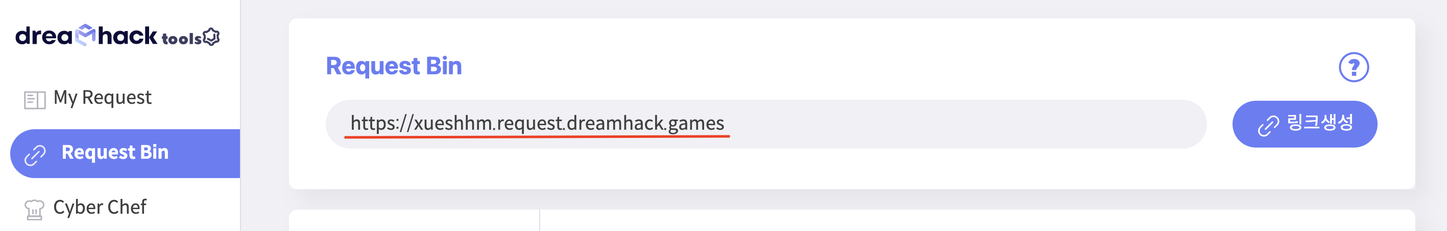 https://tools.dreamhack.games/ 링크로 접속해서 Request Bin을 클릭한다. 밑줄 친 링크를 복사한다.