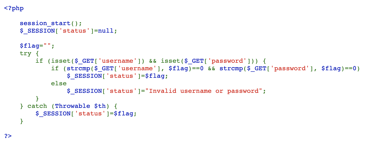 코드도 제공되고 있다. 분석해보면, username과 password 값을 GET 방식으로 받고 있다. 둘다 값이 존재하면 $flag와 값을 비교해서 $flag와 값이 같으면 $_SESSION['status']에 $flag를 저장하고 다르면 "Invalid username or password"라는 문구를 저장한다. 예외가 발생하면 $_SESSION['status']에 $flag를 저장한다.