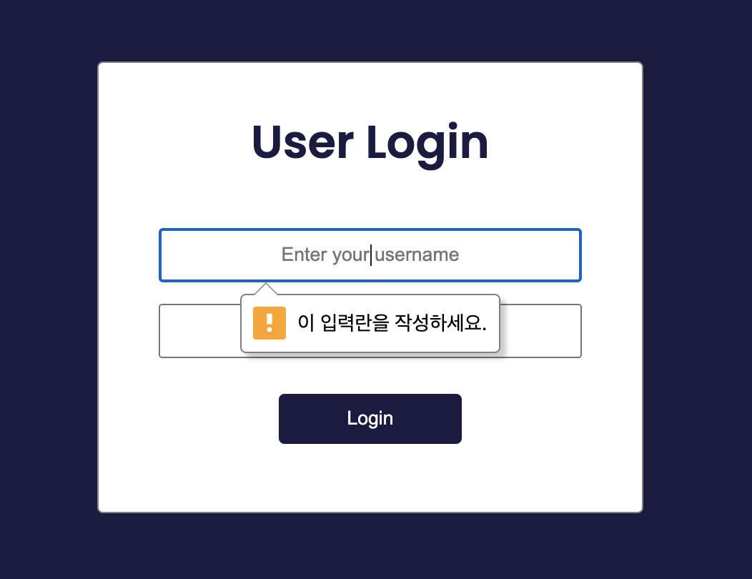 폼이 전송되지 않고 '이 입력란을 작성하세요.'라는 알림이 뜬다. HTML 코드 상에 required 속성이 들어가 있는 것 같다.