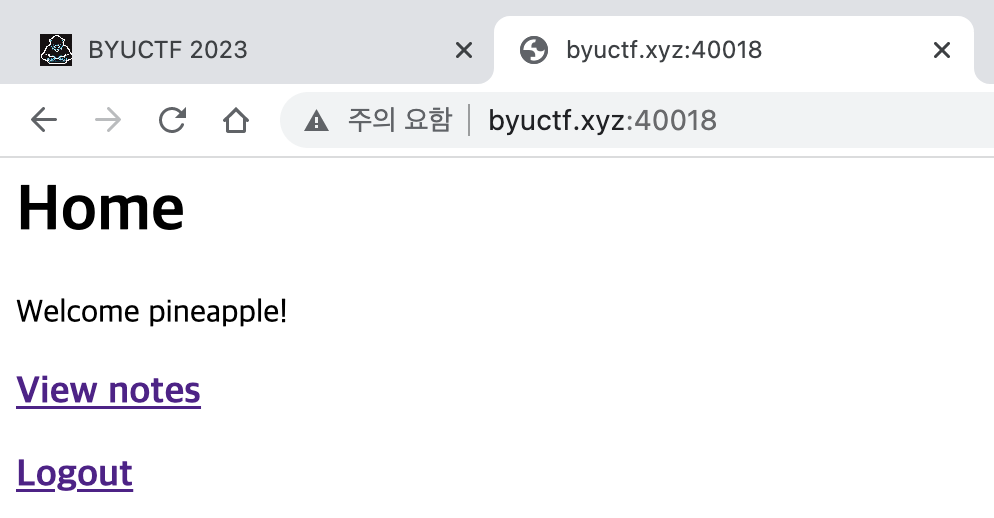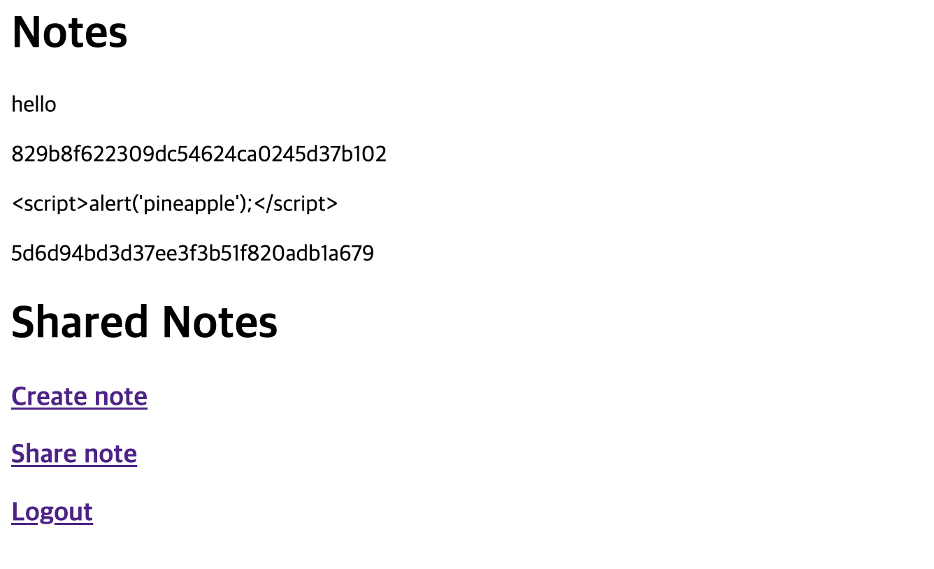 더불어 Stored XSS 취약점이 발생하는지 확인하기 위해 '<script>alert('pineapple');</script>'이라는 내용으로도 노트를 생성해보았다. 노트 생성 후 업로드된 노트 목록을 살펴보면 아래와 같은 내용을 확인할 수 있다.