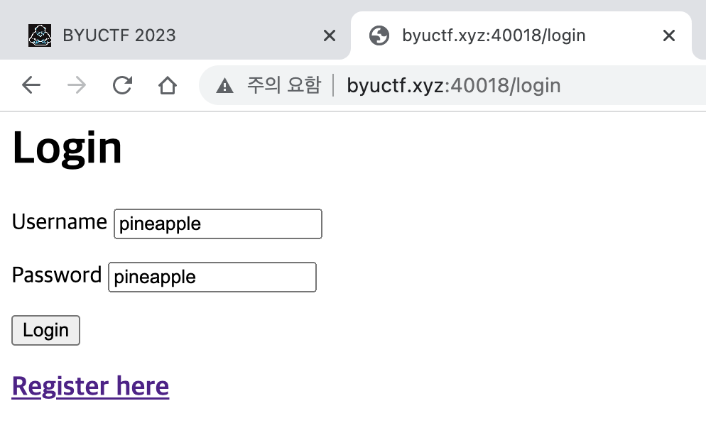 username과 password 모두 9자리 이상이 되어야 함을 알 수 있다. usename을 임의로 'pineapple'로 하고 password를 '123456789'로 하여 사용자를 등록했다.