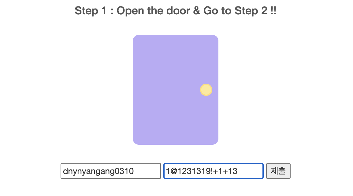 끝부분을 보면 $name(닉네임)이 "dnyang0310"이고 $pw(패스워드)가 "d4y0r50ng+1+13"일 때 step2가 열리는 것을 알 수 있다.