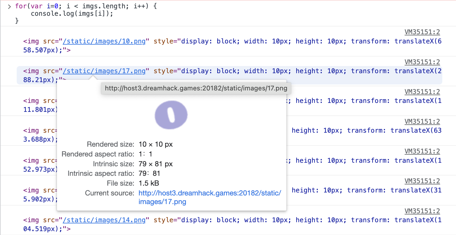 개발자 도구의 Console 탭에 익스플로잇 코드를 입력하면 imgs 배열의 요소들이 출력된다.