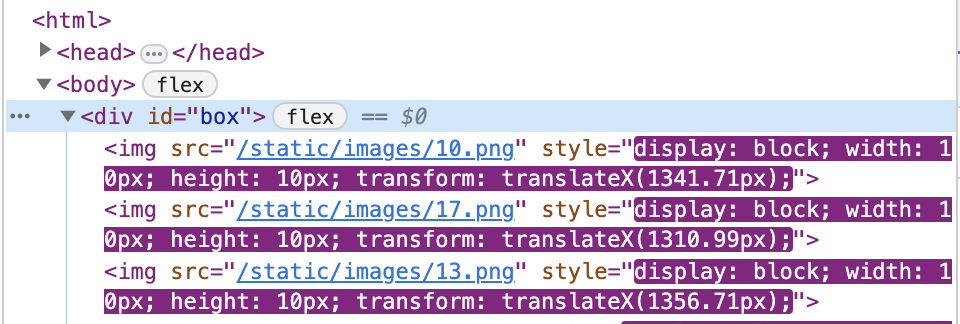 <div id="box"></div> 태그 안에는 19개의 <img> 태그들이 들어있다.