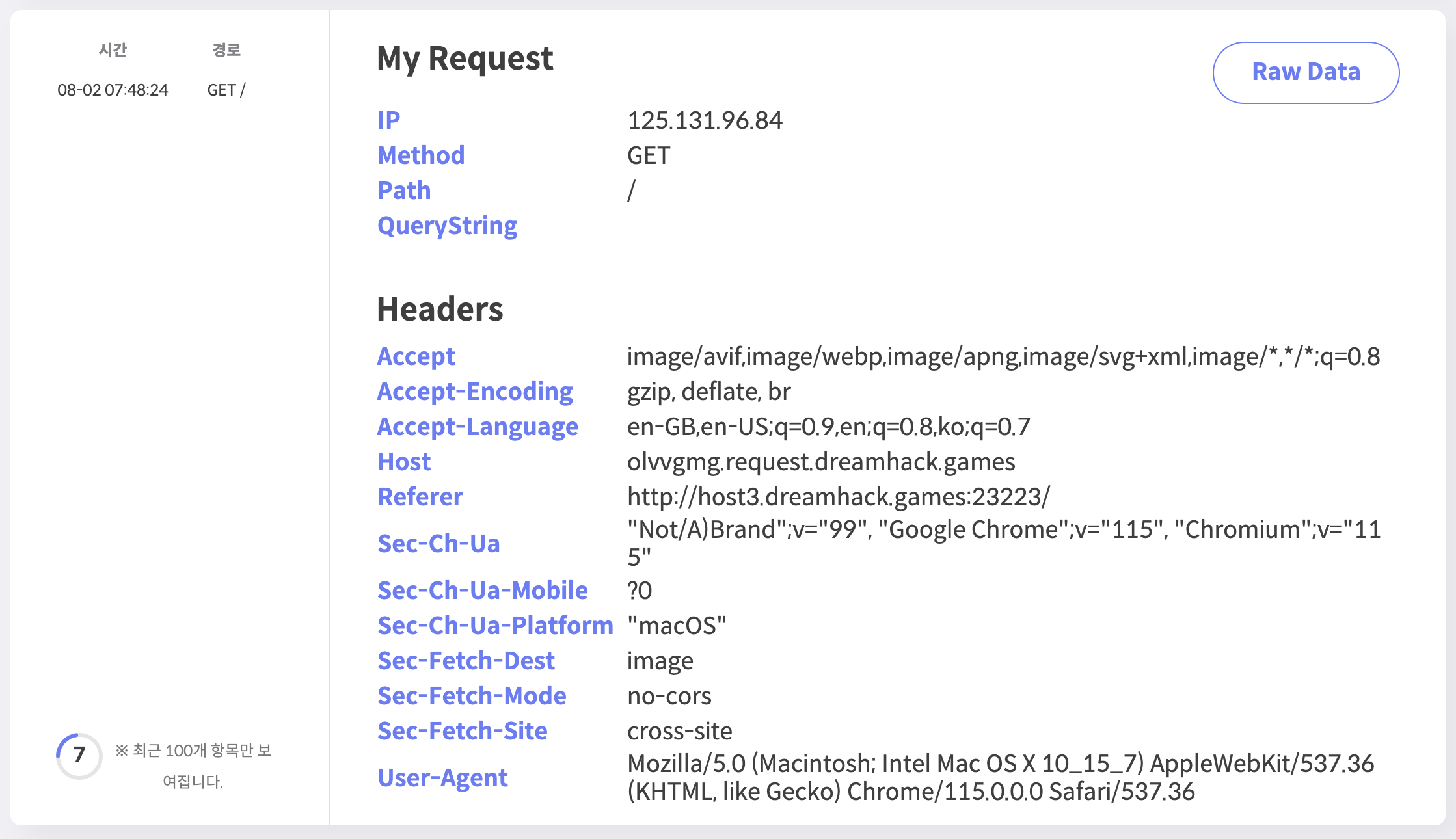 다시 Dreamhack Tools의 Request Bin 페이지로 들어가보면 GET 요청이 온 것을 확인할 수 있다.