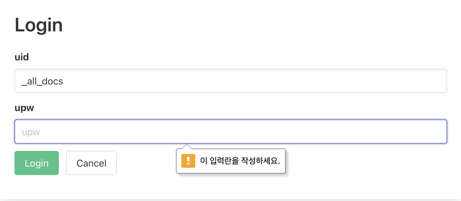 uid에 _all_docs를 입력하고 upw 값을 비운 채로 Login을 시도했는데