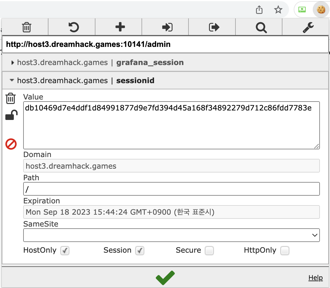 EditThisCookie라는 프로그램을 이용해 sessionid를 admin의 sessionid로 수정한다. 이제 다시 인덱스 페이지로 가면 플래그를 얻을 수 있다.