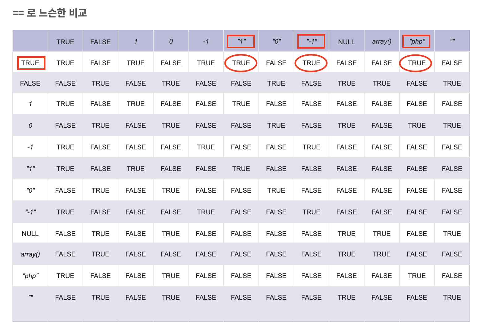 ==은 느슨한 비교로, 위의 표를 보면 한 쪽 인자가 비어있지 않은 문자열이고 한 쪽 인자가 true이면 비교 결과가 항상 true이다.
