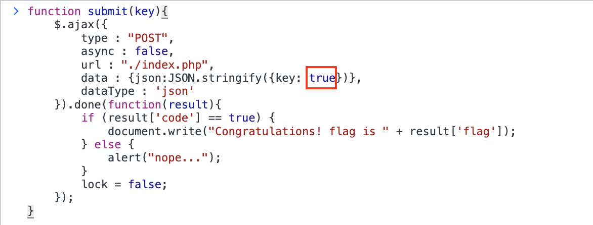우리가 보고 있는 코드에서는 $key가 문자열이므로 json에 전달하는 값을 true로 하면 flag를 만날 수 있다.
