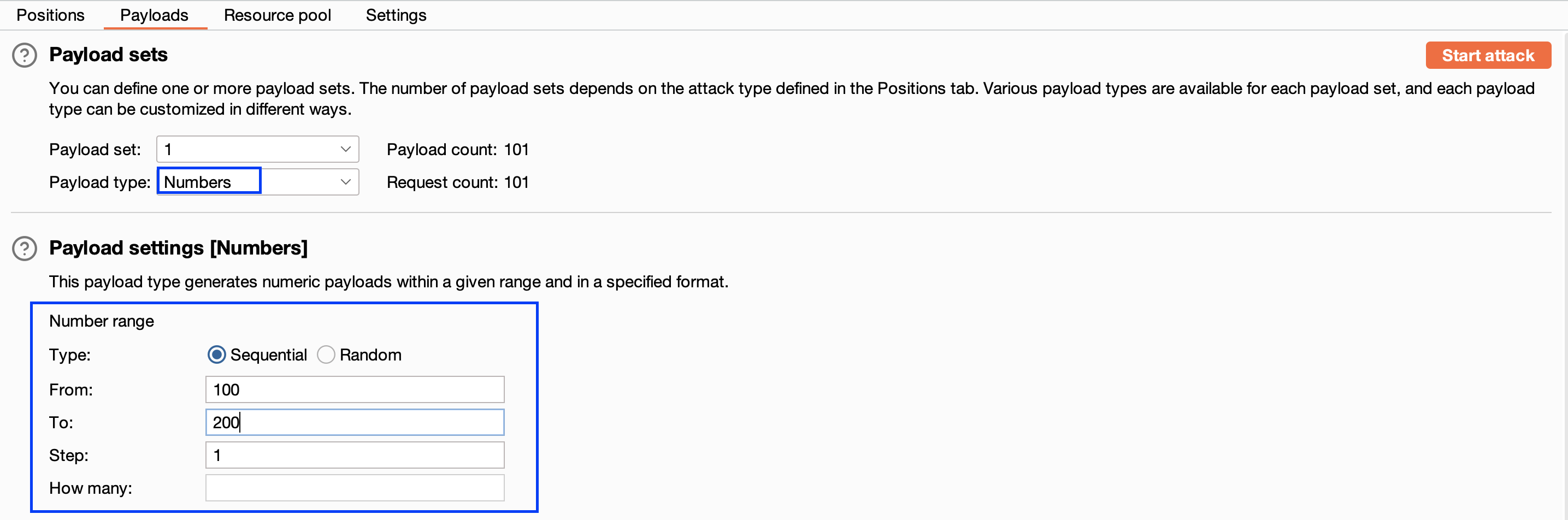 비밀번호는 100~200의 정수이므로 Payload type을 Numbers로 설정한다.