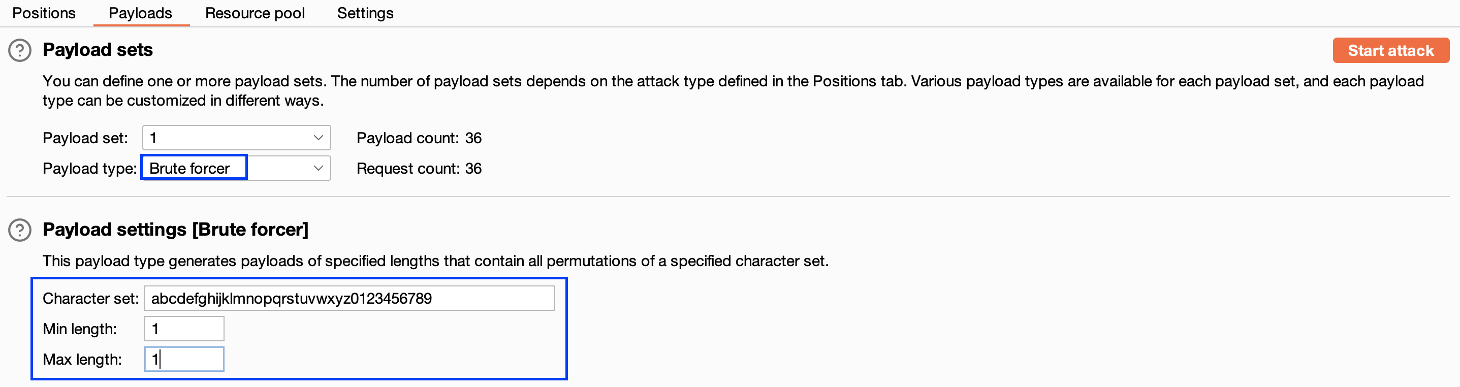 payloads 탭으로 이동해서 payload type을 Brute forcer 로 설정하고
