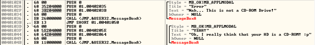 서로 다른 문구를 출력하는 두 개의 MessageBoxA 함수가 있다.