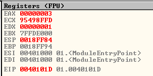 GetDriveTypeA 함수의 return 결과를 확인해보면 EAX는 00000003, ESI는 00401000이 되어있다.