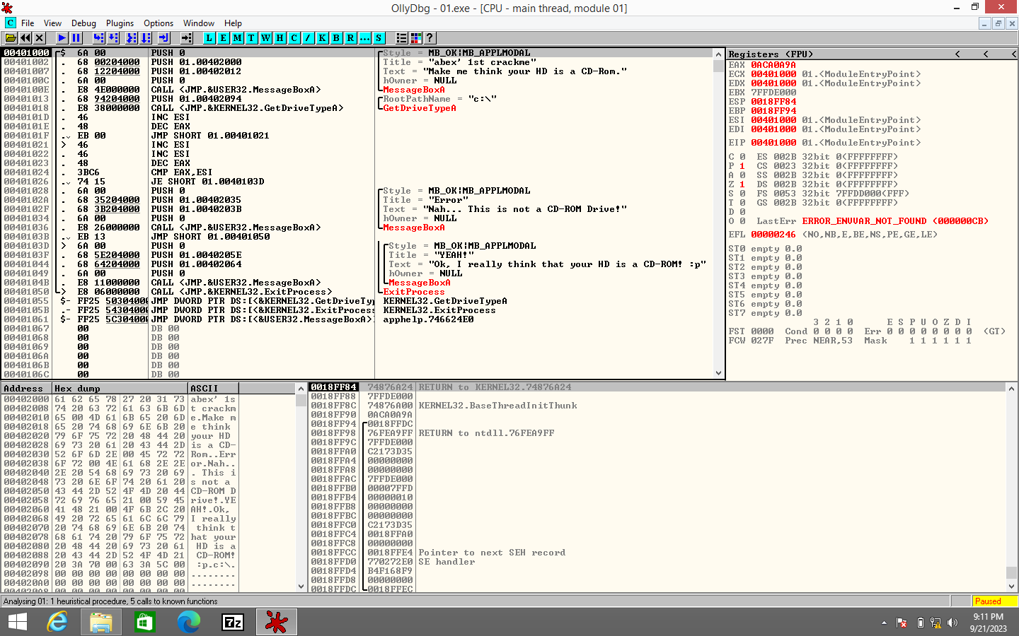 첫번째 breakpoint를 걸어놓은 GetDriveTypeA 함수까지 도달한 후