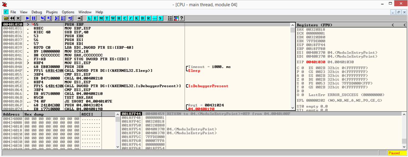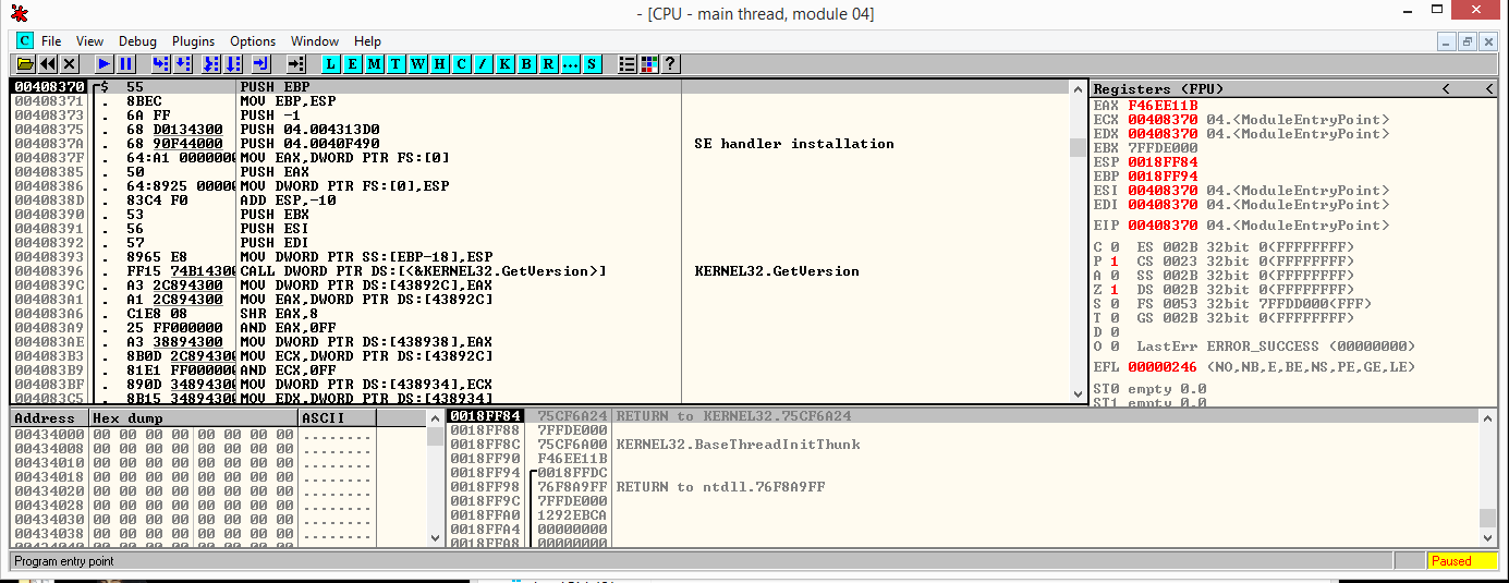 올리디버거를 이용해 04.exe 파일을 열어보았다.
