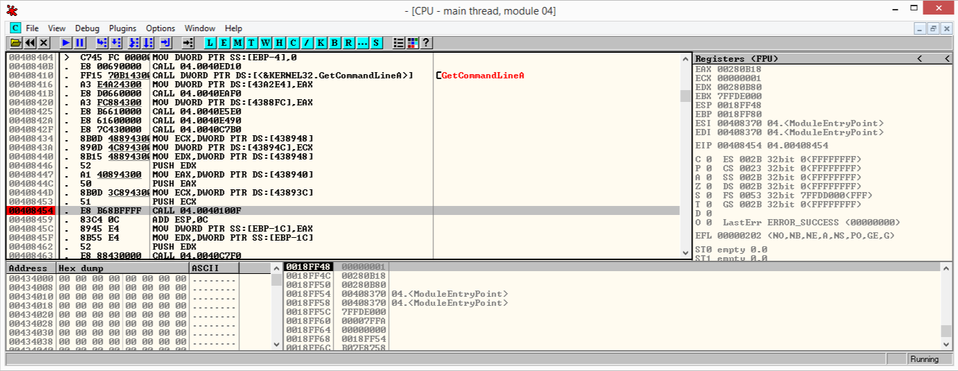 00408454 주소에 있는 CALL 명령어를 실행하는 시점부터