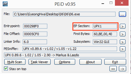 UPX로 패킹된 것을 확인할 수 있다.