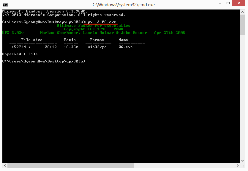 UPX 언패킹 툴인 upx303w를 이용해 언패킹한다.