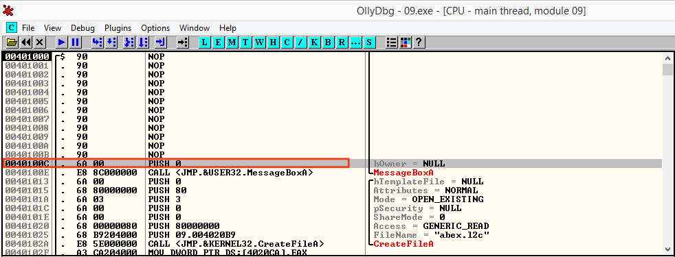 프로그램이 실질적으로 시작하는 위치는 0040100C이다.