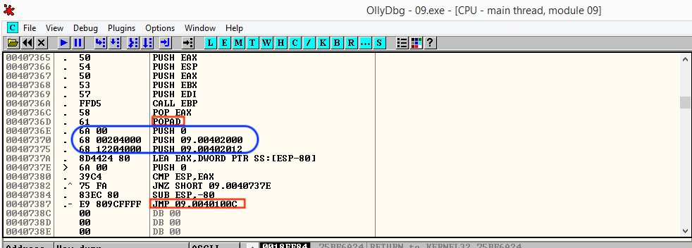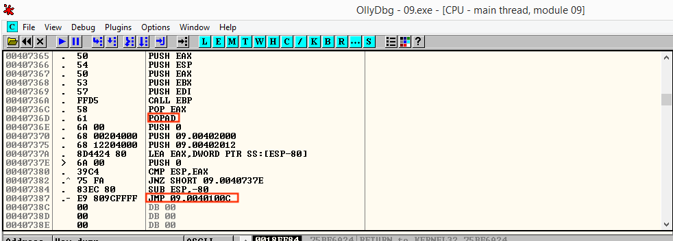 이제 다시 패킹된 상태의 09.exe를 디버거로 열어 OEP로 JMP하는 명령어를 찾아본다.