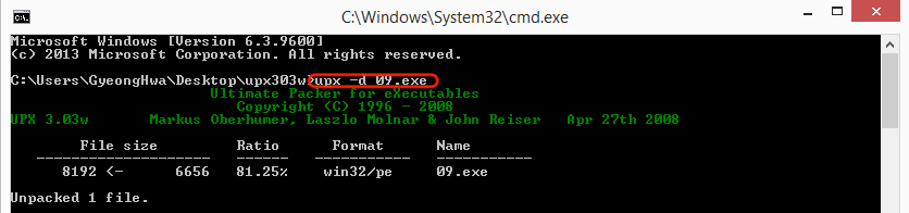 UPX로 패킹되어있는 파일을 언패킹하는 툴 중 하나인 upx303w을 이용해 언패킹한다.