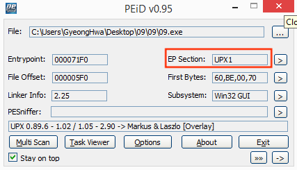 PE 파일을 정적 분석할 때 사용하는 툴인 PEiD를 이용해 09.exe를 열어본다.