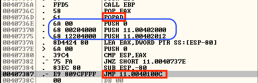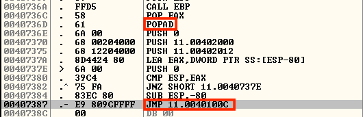 이제 다시 패킹된 상태의 11.exe를 디버거로 열어 코드의 시작부분인 0040100C로 JMP하는 명령어를 찾아본다.