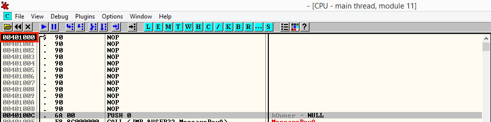 파일을 열었을 때 프로그램의 시작 위치가 00401000으로 잡힌다.