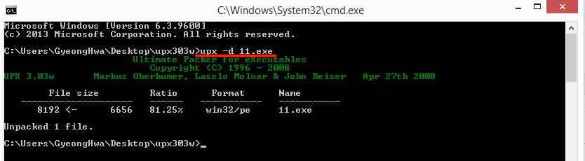 UPX로 패킹되어있는 파일을 언패킹하는 툴 중 하나인 upx303w을 이용해 언패킹한다.
